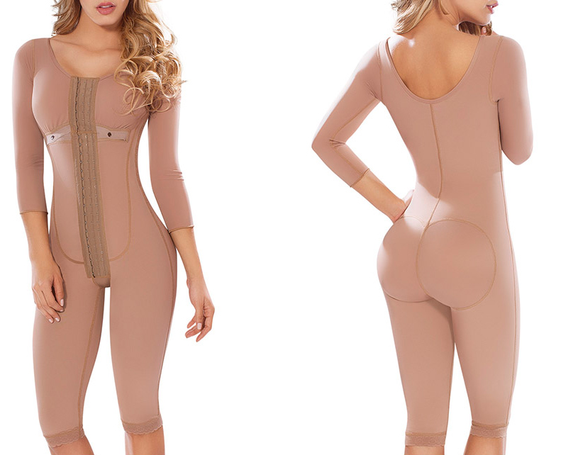 Description: Full body girdle w/bra & sleeves upto the knee design allows a comfortable recovery after surgical procedures, has a fabric material that exerts pressure where inflammation occurs more, inside fabric has a soft structure that provide comfort and freshness. Allows a better patient recovery, helping skin to re-attach to the muscular tissue, reduces significantly the liquid retentions, pain and flaccidity and offer more mobility and safety's patient. The girdles are design especially for cosmetic surgery, several references, sizes and especial measures are made. Two (3) positions crotch hook & Eye closure. Adjustable Straps.