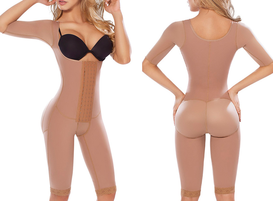 Description: Full body girdle braless & sleeves upto the knee design allows a comfortable recovery after surgical procedures, has a fabric material that exerts pressure where inflammation occurs more, inside fabric has a soft structure that provide comfort and freshness. Allows a better patient recovery, helping skin to re-attach to the muscular tissue, reduces significantly the liquid retentions, pain and flaccidity and offer more mobility and safety's patient. The girdles are design especially for cosmetic surgery, several references, sizes and especial measures are made. Two (3) positions crotch hook & Eye closure. Adjustable Straps.