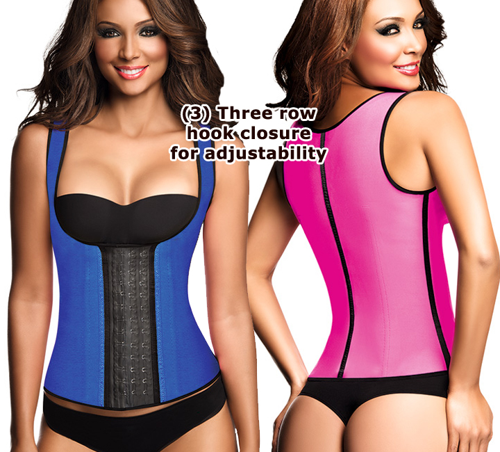 Description: This vest not only compresses your waist and abdomen - it slowly takes you to your target figure by making you sweat with its internal Latex lining. Perfect for exercising, walking and for work. Shown in Blue and Fuchsia |