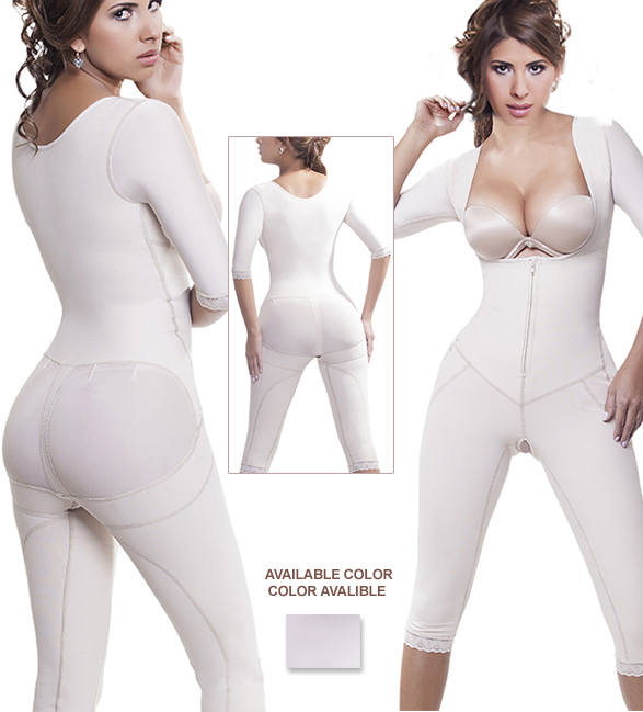 Descripción:  Ayuda Eliminar Celulitis. Faja post quirurgica estilo capri de manga con realce de cadera  - Zipper frontal. El diseño de esta faja permite una mejor recuperación luego de procedimientos quirúrgicos, cuenta con una tela que ejerce presión en las zonas donde se presenta mayor inflamación y en el interior cuenta con una tela suave que le brinda comodidad y frescura al paciente. Muchos cirujanos la recominedan por que es muy especial para aquellas personas que se practican varias cirugías a la vez: glúteos, brazos, muslos y abdomen. Permite que la persona tenga una mayor recuperación, ayudando a que la piel se adhiera nuevamente al tejido muscular, mejora notablemente la retención de líquidos, la flacidez, disminuyendo en gran parte el dolor y dándole al paciente una mayor movilidad y seguridad. Estas fajas son diseñadas para cirugías estéticas. Faja diseñada para moldear el cuerpo y ayudar a acentuar y levantar el busto y glúteos, su forma debajo del busto ayuda a central y levantarlo de forma natural, la parte baja de los glúteos esta diseñada para levantarlos y controla los brazos. Su tela se ajusta perfectamente a tu cuerpo y reduce la cintura y el abdomen. Esta faja te brinda la mejor modelación con máxima comodidad. Color: Beis.